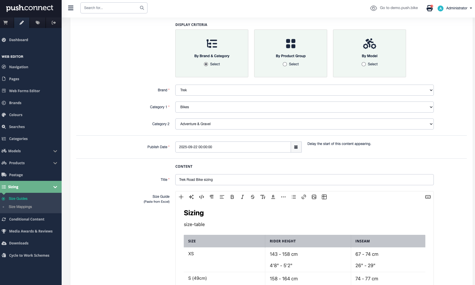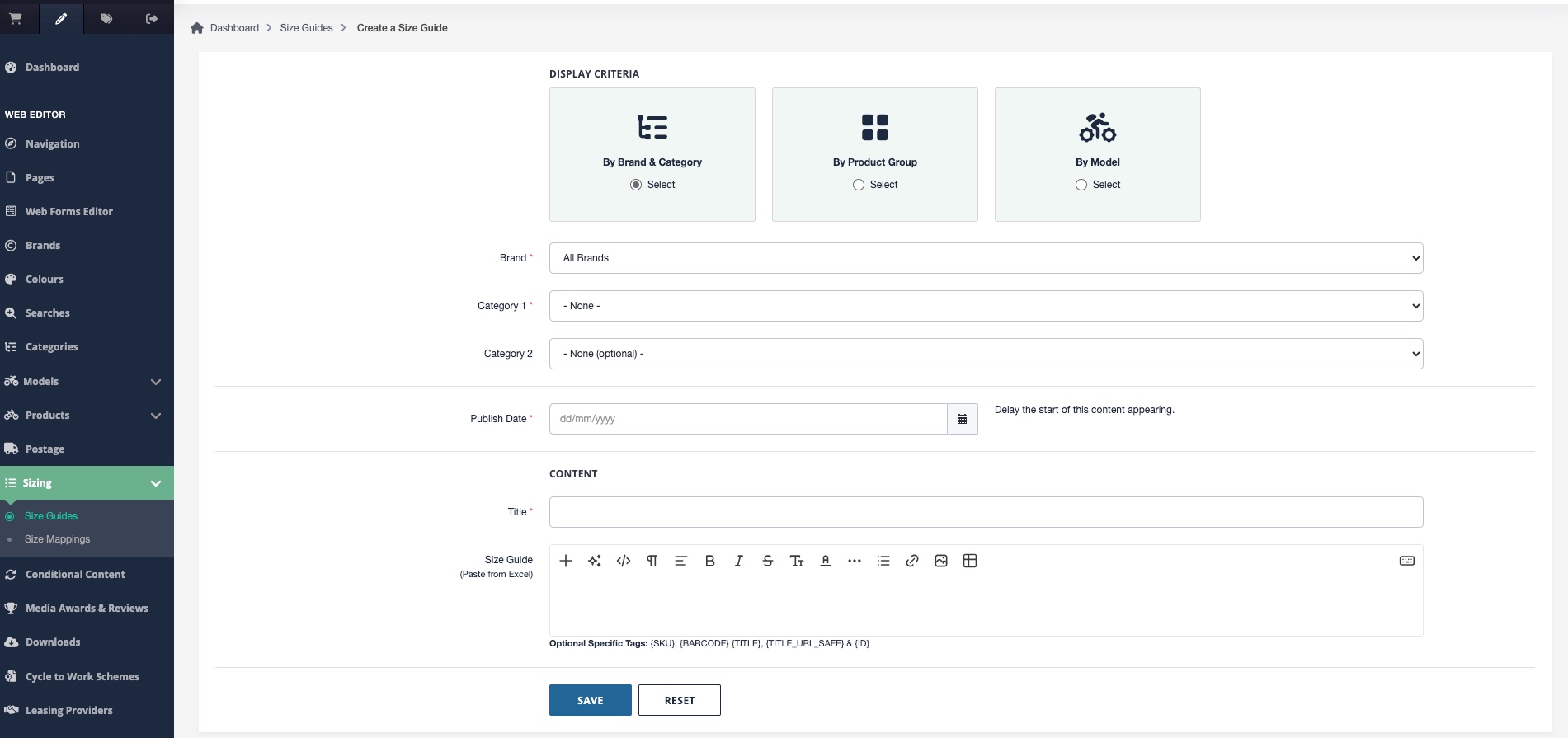 To get started, please log in to the Push Retail admin area and navigate to the "pencil" icon in the sidebar. From here, you'll see "Size Guides." This will allow you to "create a size guide". Size guides are usually set by brand and category. However, you can ignore either and create a size guide for all brands or categories independently.