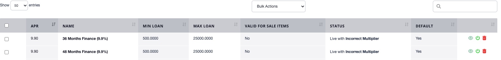 Once your finance provider has been set-up on PushRetail you'll see your preloaded finance products by visiting "Pencil" > v12 Products, Novuna Products or Santander Products. From here you can re-import the products or click and edit each individual product.