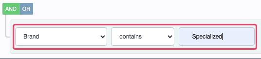 As in this case, we want to choose products that match Specialized we choose the "contains" operator. We could also use "equal" if we are confident that the brand is exactly written as "Specialized".
